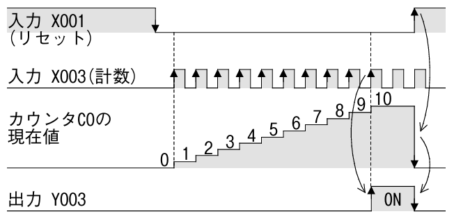 - Nếu đầu vào Reset (X001) được bật (ON), giá trị hiện tại của Counter sẽ trở về 0, và tiếp điểm của Counter sẽ tắt (OFF).