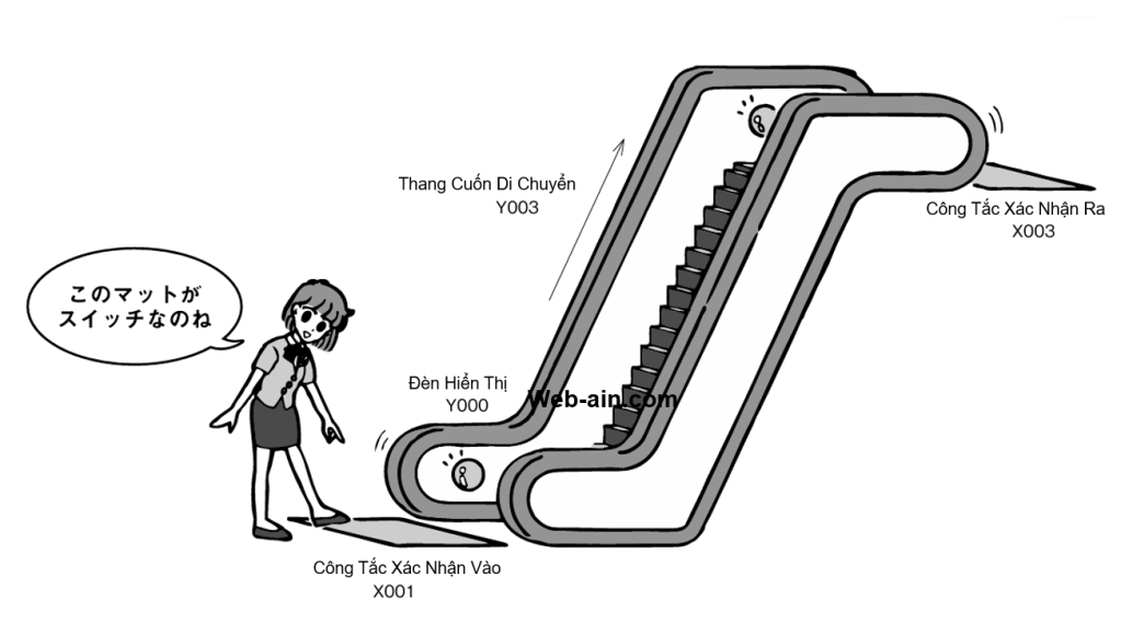 - Cả hai công tắc phát hiện người vào và ra Thang Cuốn đều là loại không giữ trạng thái, nghĩa là chúng chỉ bật trong khoảnh khắc khi có người đi qua.