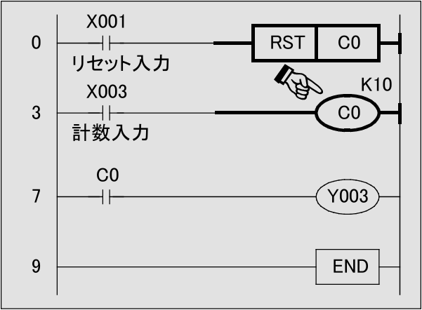 - Counter C0 sẽ đếm số lần thay đổi trạng thái từ OFF → ON của tiếp điểm (X003).