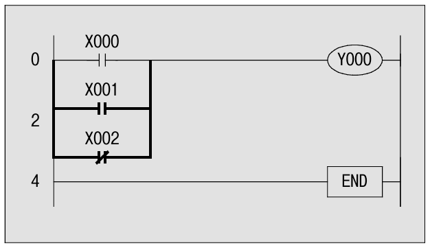 Ví dự với chương trình PLC sau: Chỉ cần 1 trong 3 điều kiện INPUT là X0,X1,X2 thỏa mãn thì Y0 được kích hoạt.