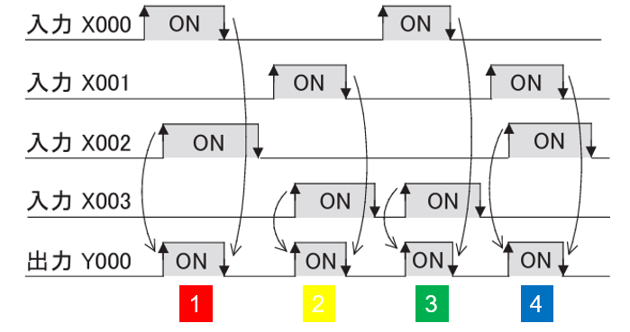 1. X0 chuyển từ trạng thái OFF sang ON, Y0 vẫn ở trạng thái OFF ; Lúc này X1 đang OFF, X2 đang ON