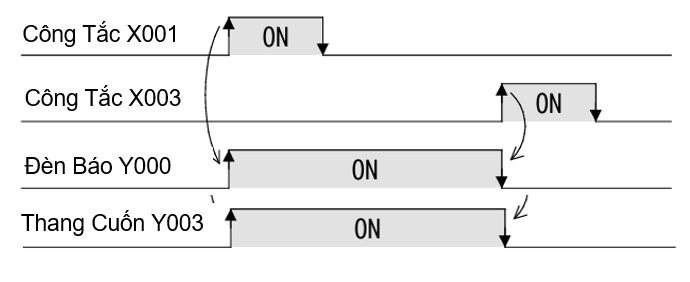 Như vậy: Y0 sẽ mất trạng thái ON khi 1 trong 3 điều kiện X0 (ON), X1(ON), X2(OFF) không thỏa mãn.