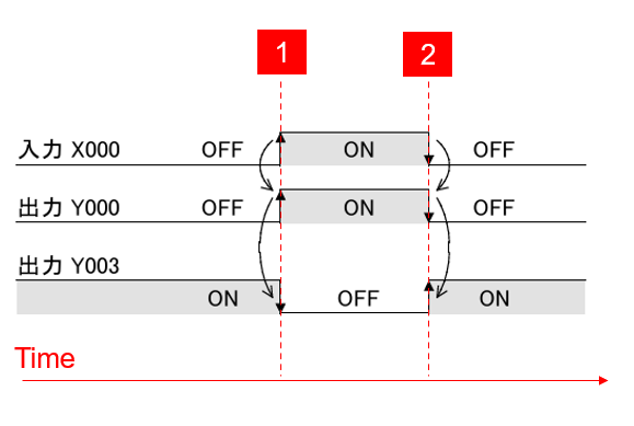 OUTPUT: Y0 cũng chuyển từ trạng thái ON sang OFF