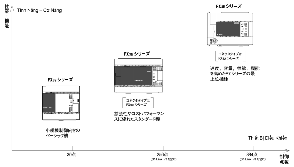 - FX3U : Dòng sản phẩm cao cấp nhất của series FX với tốc độ, dung lượng, hiệu suất và chức năng được nâng cao ( Kết nối GOT… ) ( 64000 step )