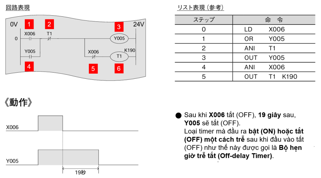 - Khi X006 (1)tắt (OFF), Tiếp điểm Y005 (4) giúp duy trì trạng thái bật của cuộn dây Y005. Tiếp điểm thường đóng X006 (5) kích hoạt bộ đếm thời gian T1, bắt đầu đếm ngược19 giây.