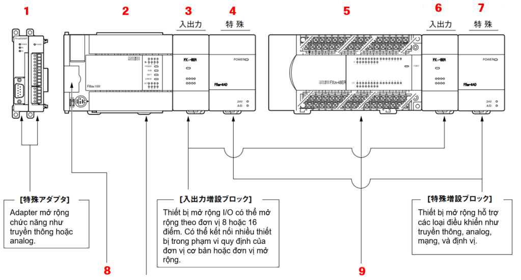 4. Khối OUTPUT Mở Rộng: Có thể mở rộng thêm 8 hoặc 6 đơn vị OUTPUT (FX2N – 2AD/ FX2N – 4AD)