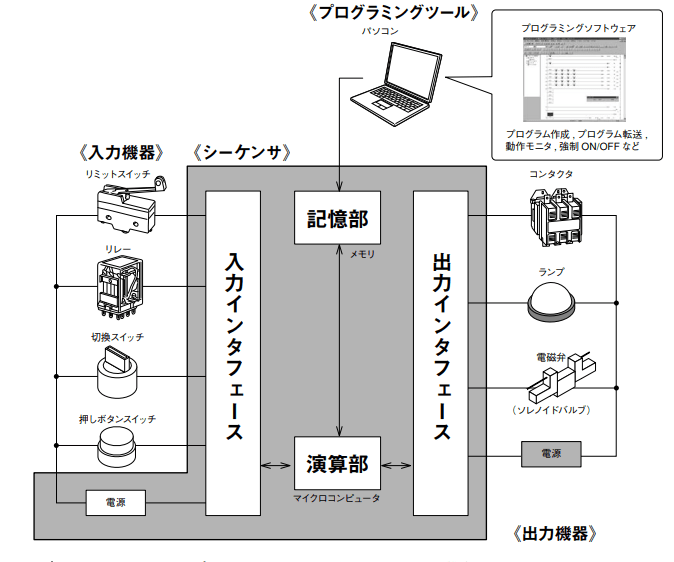 PLC được cấu thành từ các mạch điện tử, với trọng tâm là vi điều khiển và bộ nhớ, xử lý các tín hiệu INPUT/OUTPUT theo mong muốn của lập trình viên thông qua các tập lệnh điều khiển.
