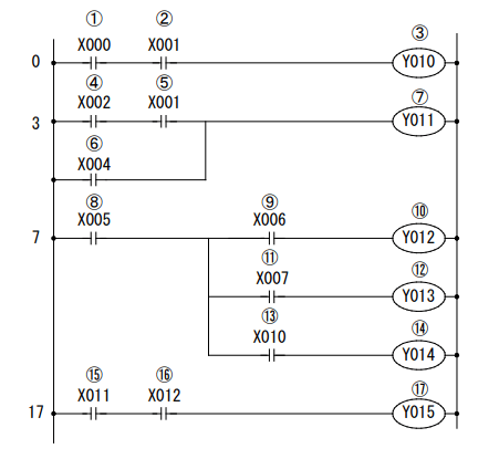 Các khối mạch được thực thi theo trình tự từ trái sang phải và từ trên xuống dưới (theo thứ tự ①, ②, ……… ⑰ step ).