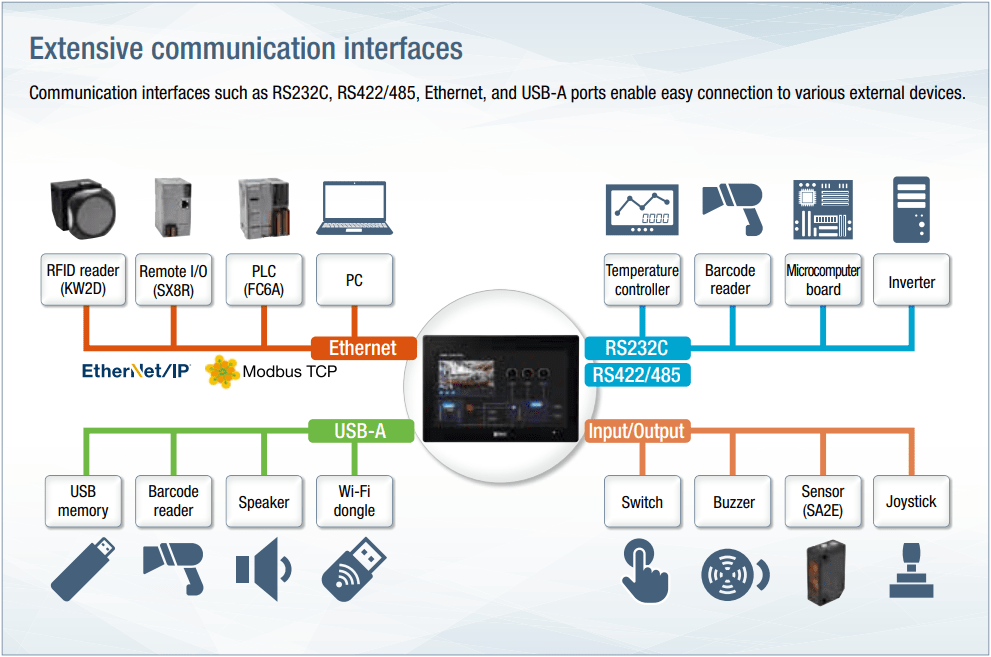 - RS232C & RS422/485: Connects to sensors, barcode scanners, and inverters.