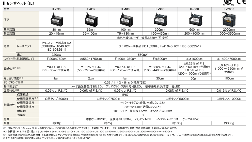 | Laser class | IL-030 / 065: Class 1 (FDA CDRH Part 1040.10 / IEC 60825-1) IL-100 ~ IL-2000: Class 2 (same standards) |