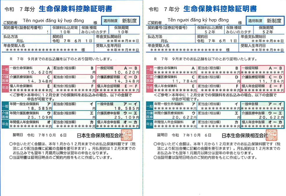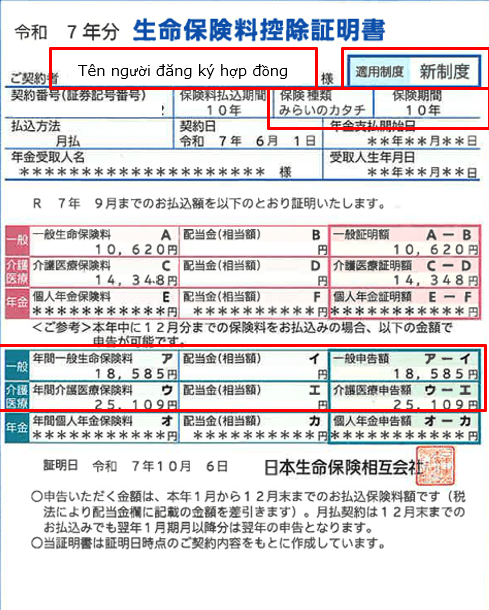 Trong giấy này ghi rõ số tiền phí bảo hiểm đã đóng trong năm và loại hợp đồng bảo hiểm, giúp người tham gia có thể khai báo giảm thuế thu nhập (所得税・住民税) trong kỳ điều chỉnh cuối năm hoặc khi tự khai thuế.